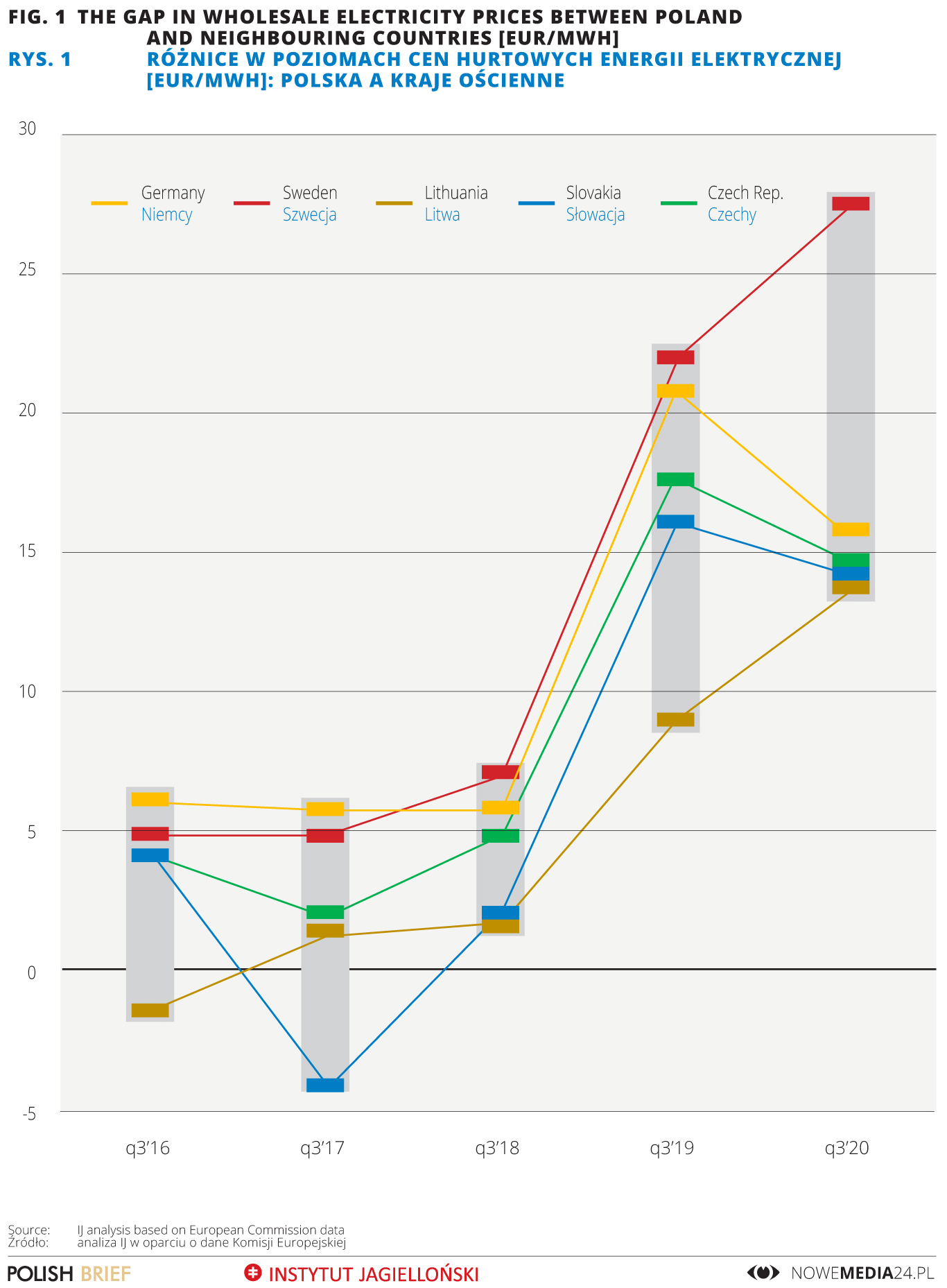 Rys. 1 Różnice w poziomach cen hurtowych energii elektrycznej [EUR/MWh]: Polska a kraje ościenne