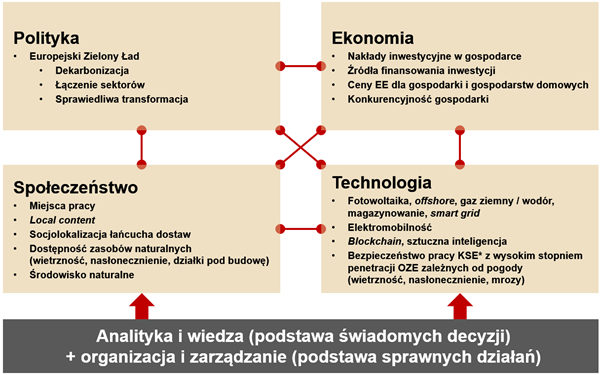 Przeprowadzenie transformacji energetycznej Polski wymagać będzie podjęcia szeregu decyzji, które uwzględniać będą kwestie polityczne, ekonomiczne, społeczne oraz technologiczne, a także interakcje (łączenie kropek) pomiędzy tymi obszarami. Aby decyzje te były świadome (informed decisions) należy zapewnić odpowiedni zasób wiedzy oraz analityki; aby działania związane z realizacją decyzji były sprawne, należy zapewnić odpowiednią organizację i zarządzanie (rys. 2).